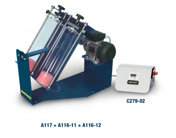 Used to determine the specific gravity of soils, it rotates two gas jars