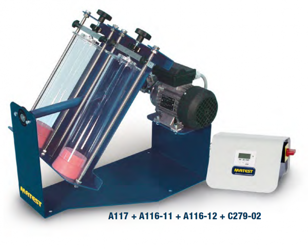 It rotates two gas jars at approx. 50 rpm to satisfy BS Standard.