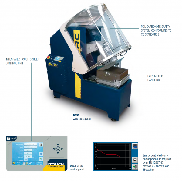 It is used to produce representative sample slabs of several dimensions of bituminous mixtures laid and compacted on site.